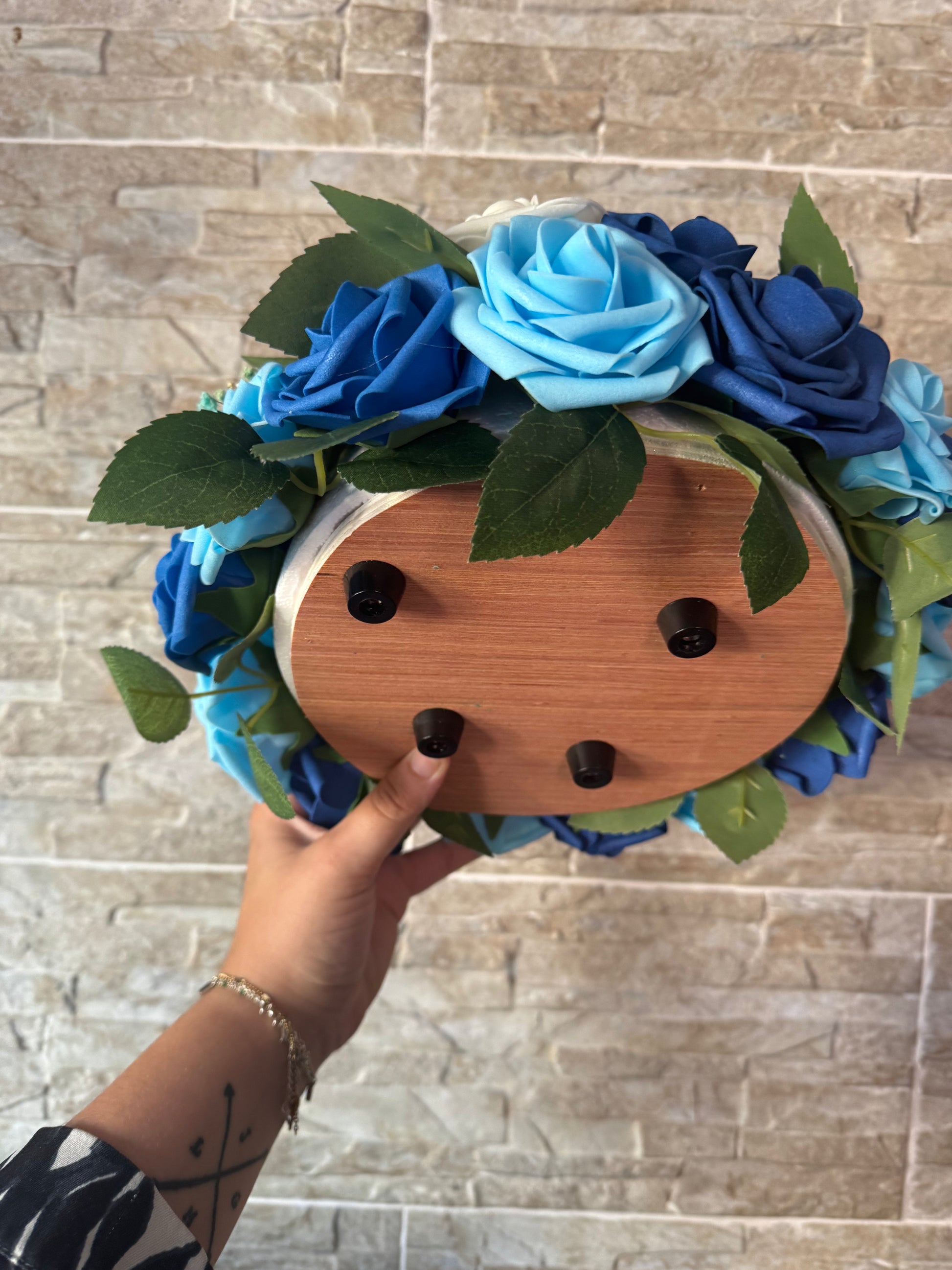 Composition : fleurs artificielles, polystyrène, bois, supports, inscriptions.