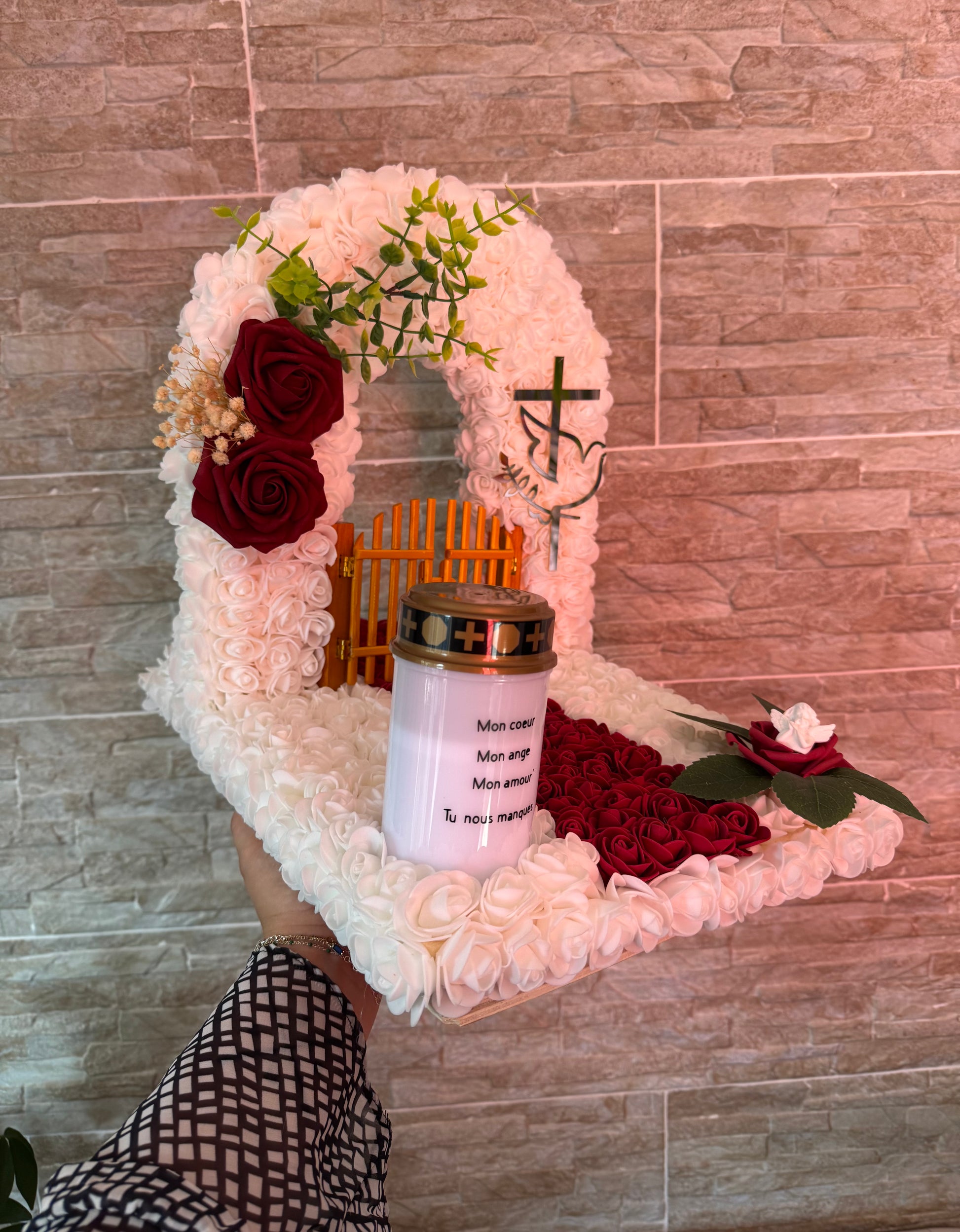 Exprimez votre amour éternel avec cette magnifique création funéraire orné de roses blanche profondes, de roses rouge foncés et d’une jolie bougie 🕯️