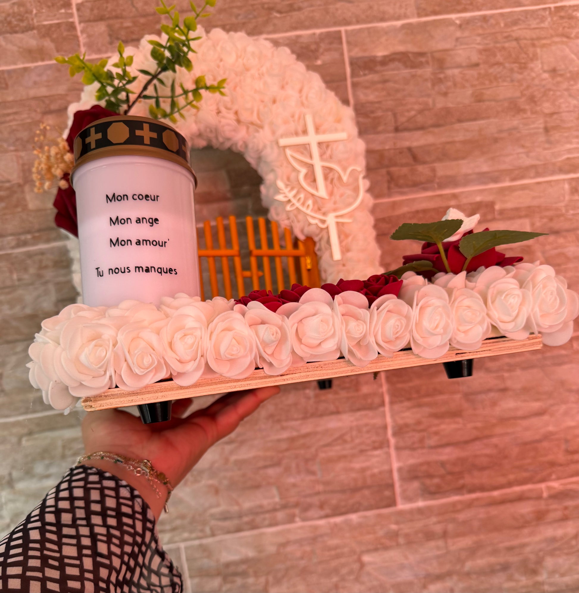 Composition : fleurs artificielles, polystyrène, bois, supports, inscriptions, bougies 🕯️