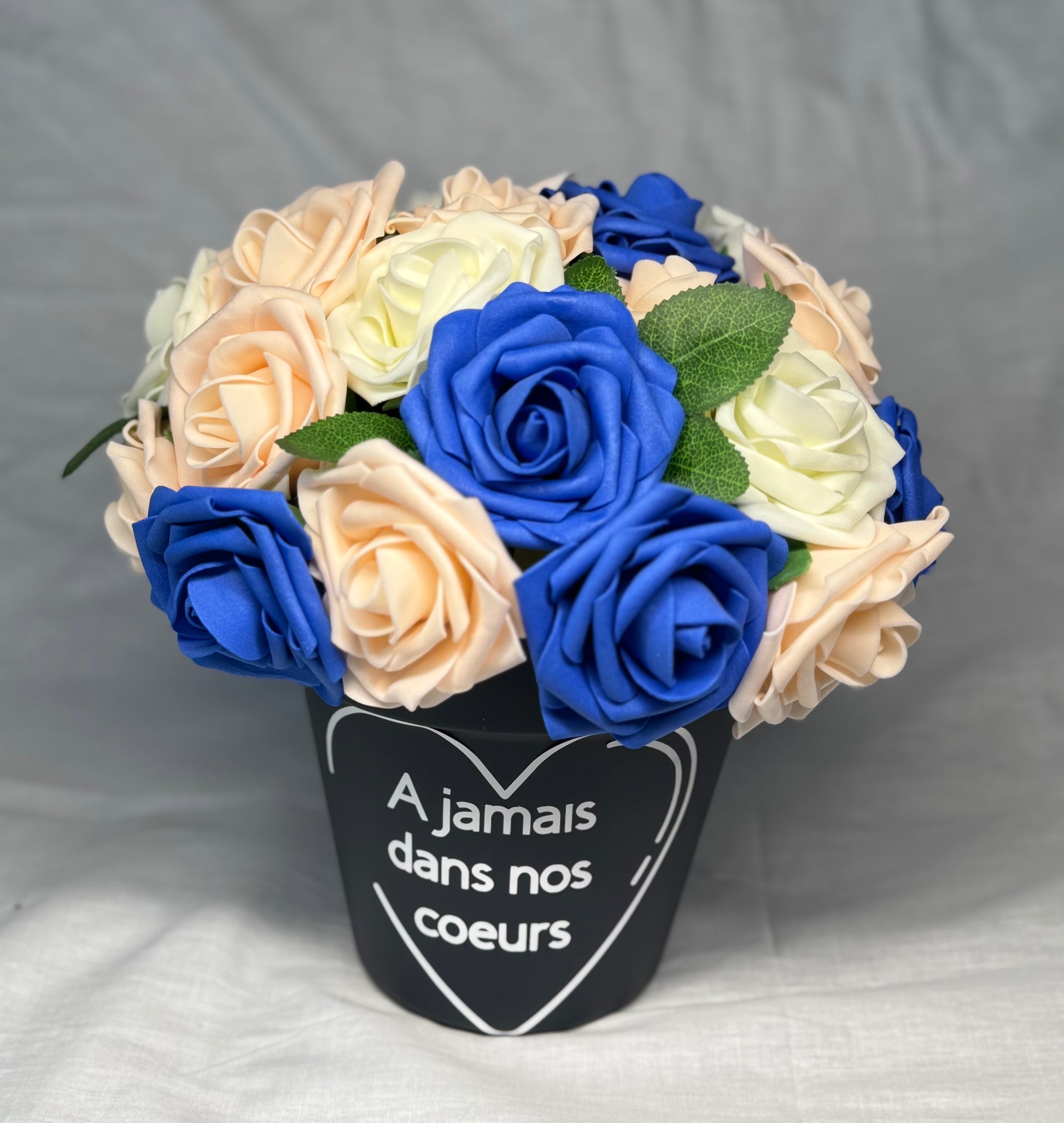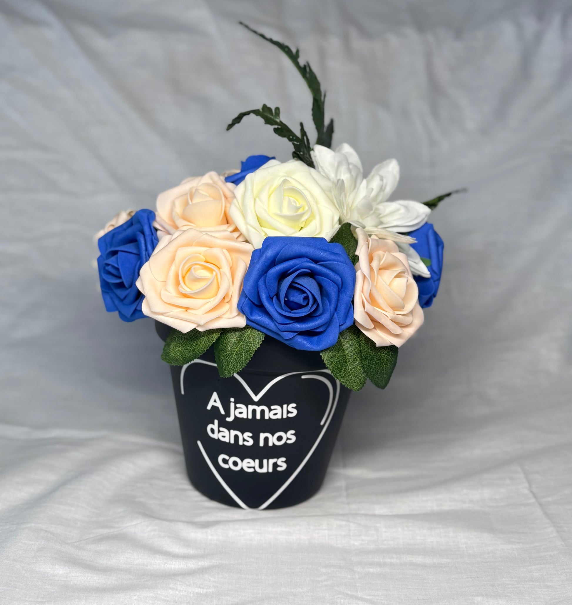 Composition : fleurs artificielles, polystyrène et pot de fleurs.